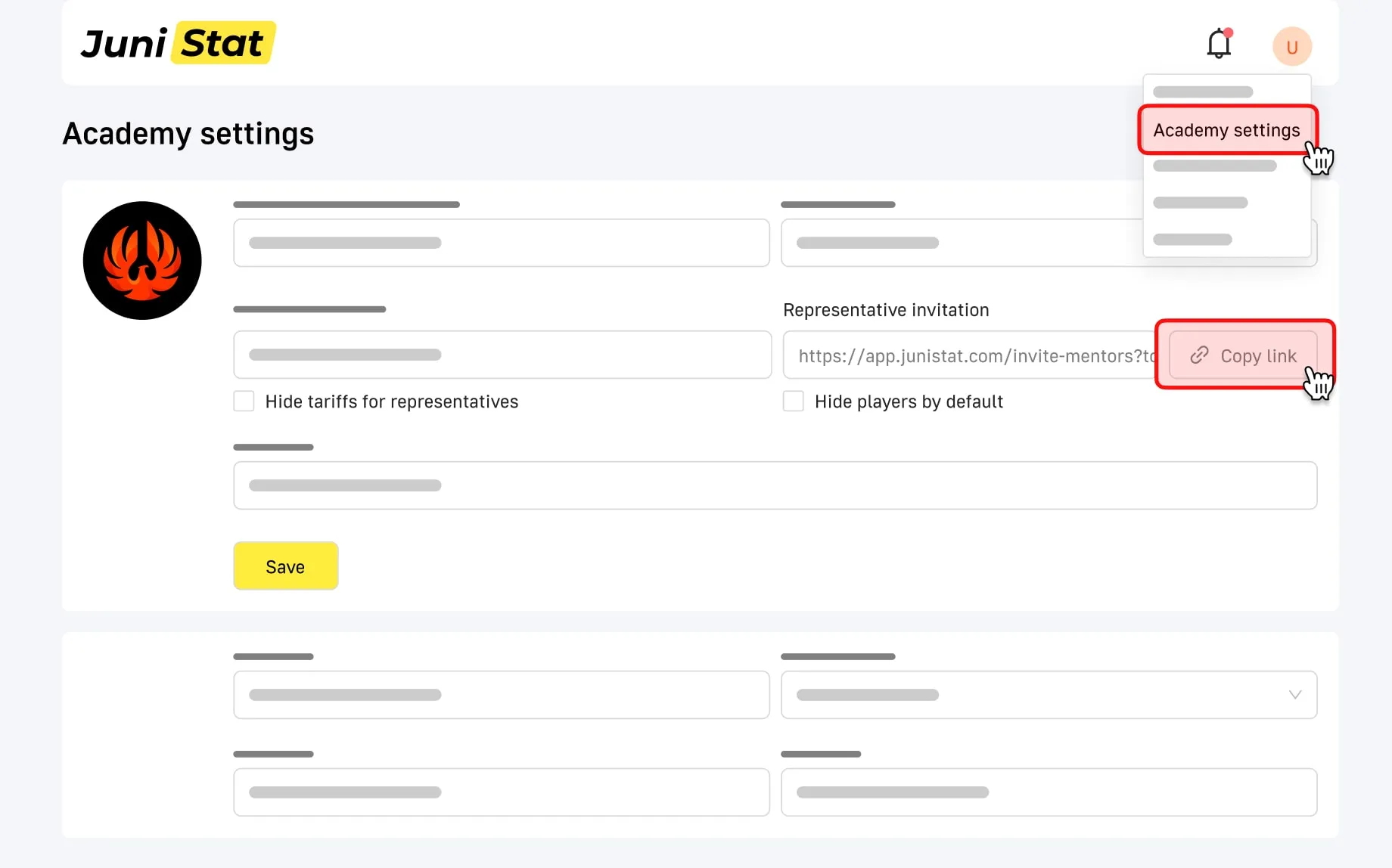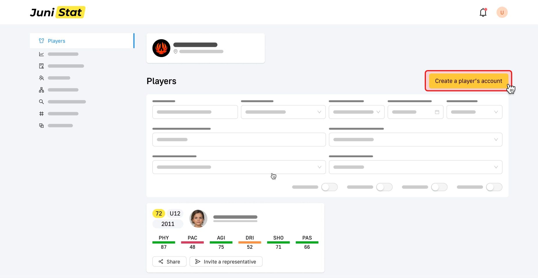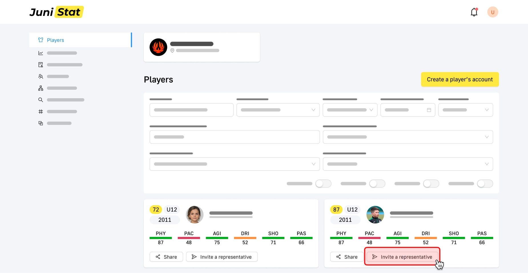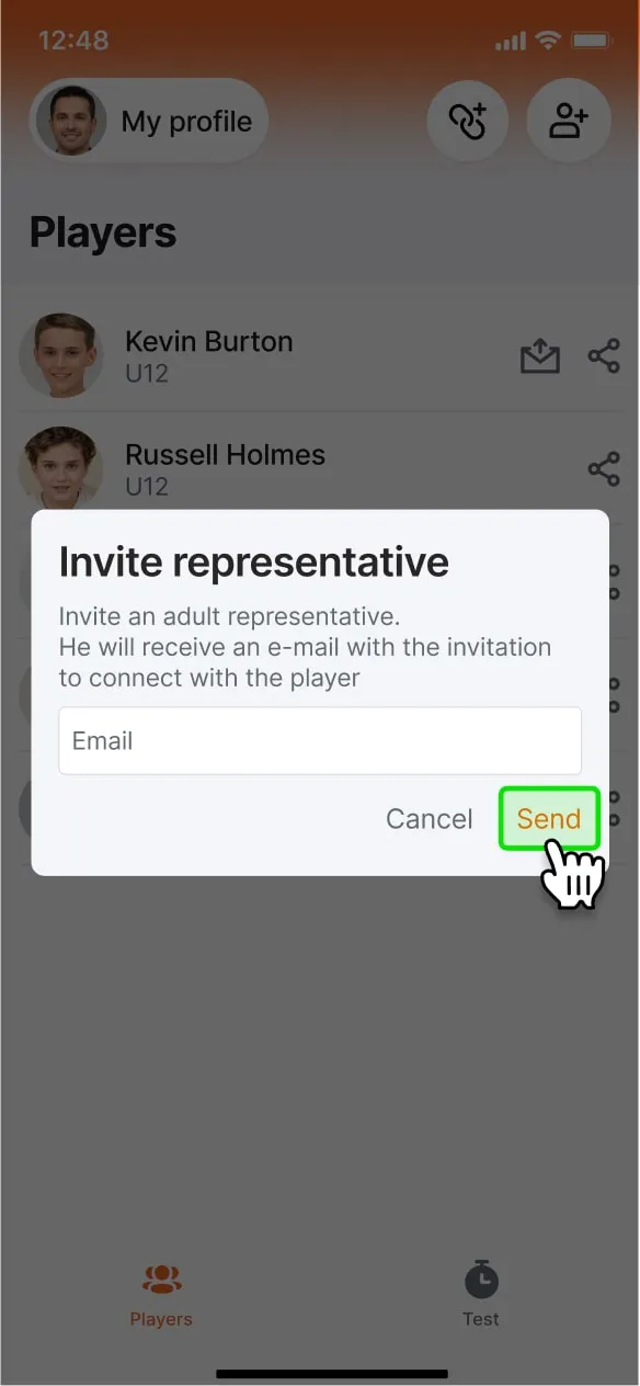 Create Players in your Academy account and connect them with representatives using the invitation link
